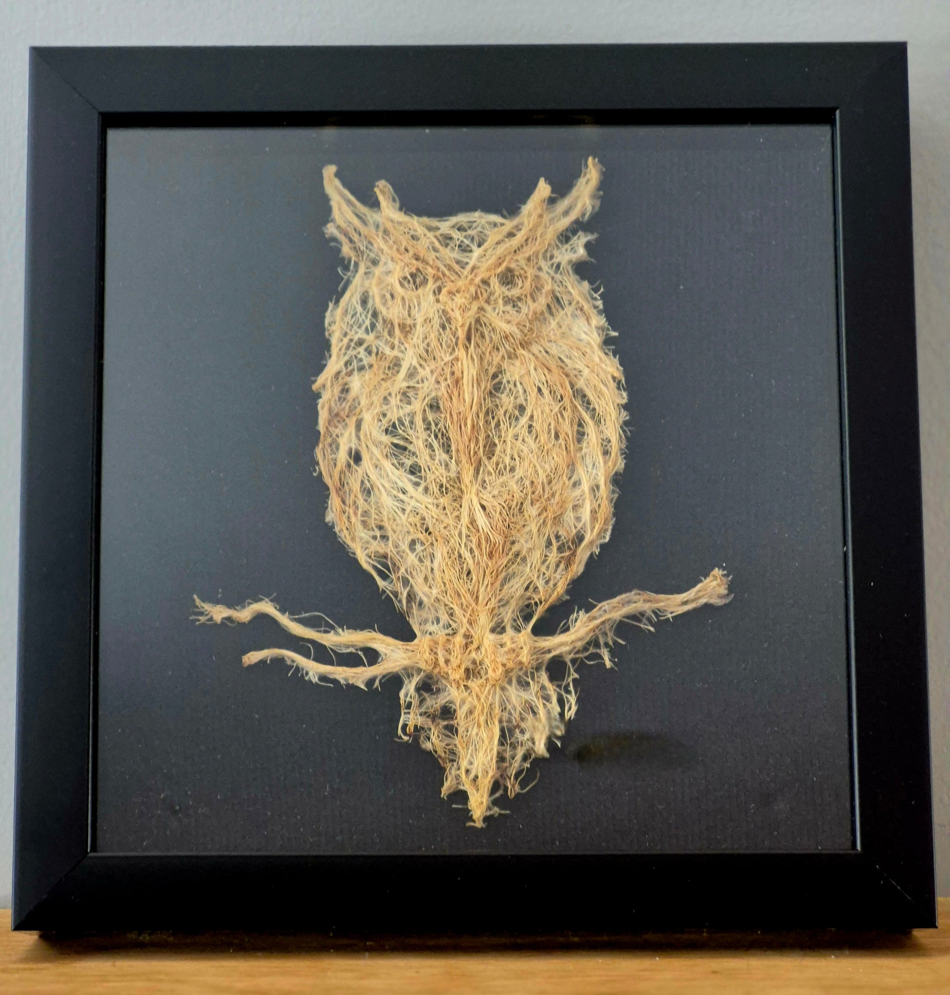 This original root design is mounted in a 9” x 9” shadow box frame with a black wood border and protective glass front, creating depth while highlighting the intricate texture and warm natural tones of the roots against a dark background.